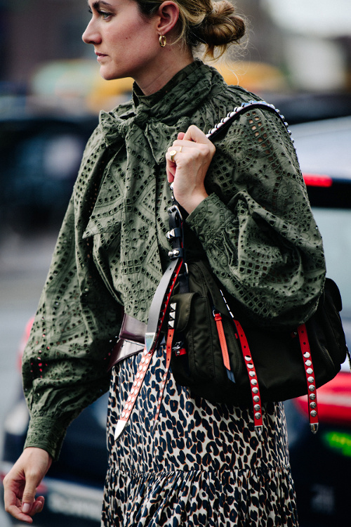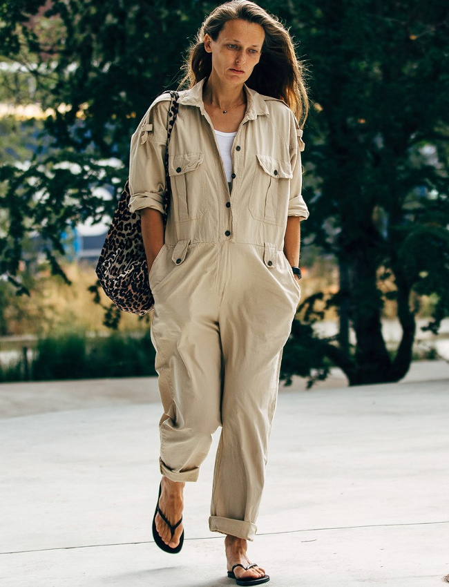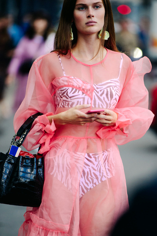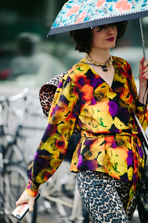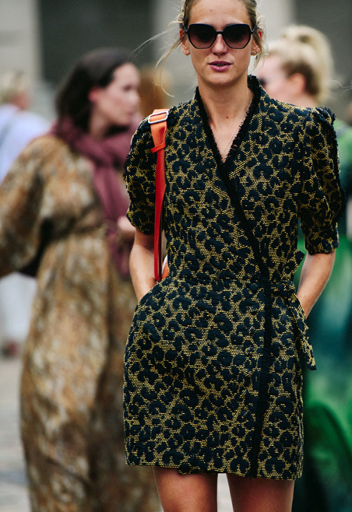 Lorsqu'elles se voient déclinées dans des tonalités camouflages, les manches ballons perdent en romantisme premier degré ce qu'elles gagnent en intérêt stylistique (voir ici). Le gimmick gentiment bourgeois du pull jeté sur les épaules s'offre un twist conceptuel (voir ici). Le tie and dye vert forêt se révèle bien plus attirant que ses homologues plus psychédéliques (voir ici). Le mix petit blouson seventies/jupe-culotte pourrait devenir l'un des combos gagnants de la rentrée (voir ici). Le port du préservatif vestimentaire fait école (voir ici). Associer dentelle anglaise kaki et tacheté léopard n'est finalement pas une si mauvaise idée... (voir ici) La chemise en cuir boutonnée haut sur une robe midi devient l'équivalent de la petite laine d'automne (voir ici). Que les choses soient claires : télescoper les imprimés sans se soucier de créer des mariages chromatiques un minimum harmonieux ne devrait en aucun cas être encouragé par les gourous fashion (je les soupçonne d'ailleurs de prendre un malin plaisir à créer ces mini chaos à la laideur snob...) (voir ici). Entre les robes translucides visant à mettre en valeur une lingerie imprimée et le duo couvrant robe/pantalon, les tendances proposent aux femmes tout et son contraire… (voir ici et là). Qu'il s'agisse du look short en jean noir/marcel blanc/lunettes de soleil ou du duo combi/tongs, il est bon de miser sur la simplicité quand autour de soi l'humeur est à l'excentricité (voir ici et là).