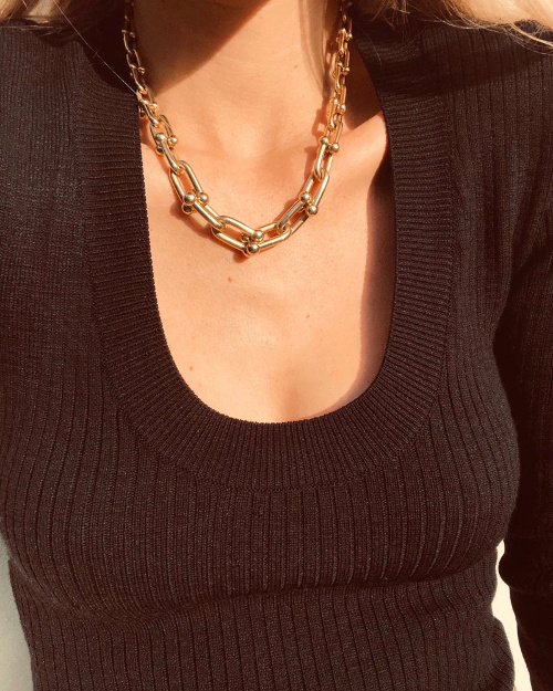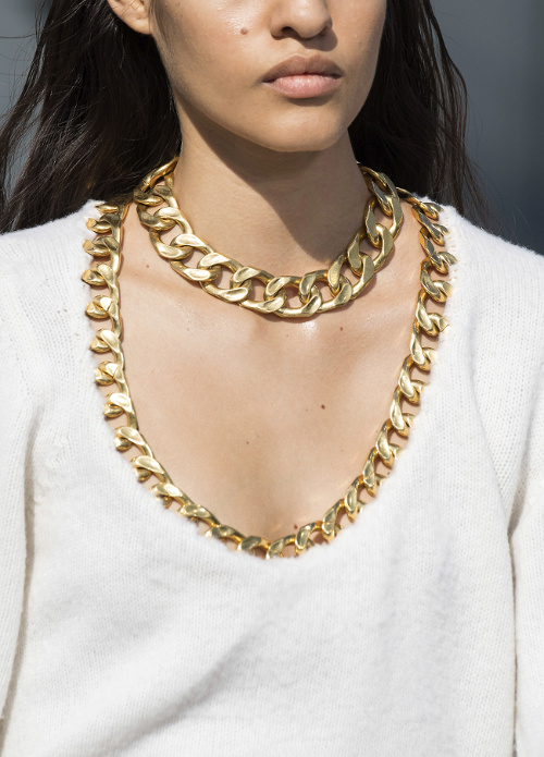 Prenant le contrepied des micro chaînettes épousant avec subtilité les clavicules des modeuses, les colliers nineties ne font pas de la finesse leur valeur cardinale. Oubliés ainsi les maillons quasi imperceptibles à la fragilité romantique : l'humeur du jour est la démonstration de force, au minimalisme impactant, à l'ostentatoire assumé. Celles désirant suivre la mode dans ses sempiternelles montagnes russes pourront ainsi imposer une retraite anticipée à leurs fines chaînettes et opter pour des maillons denses évoquant ceux des gourmettes de communion.