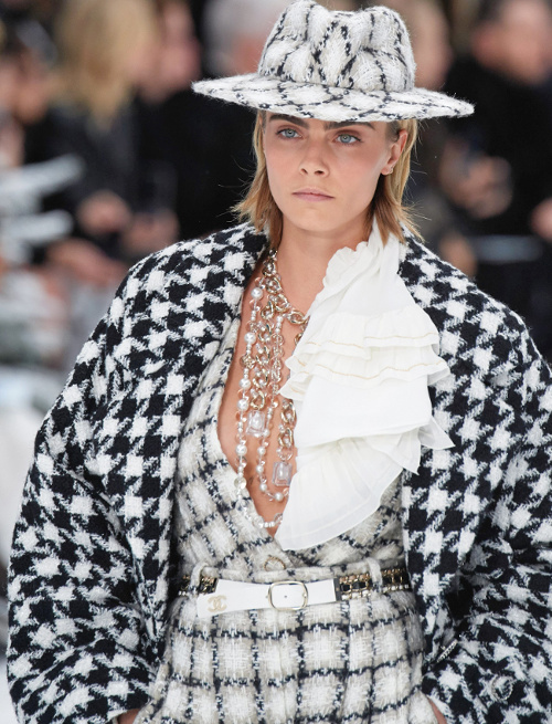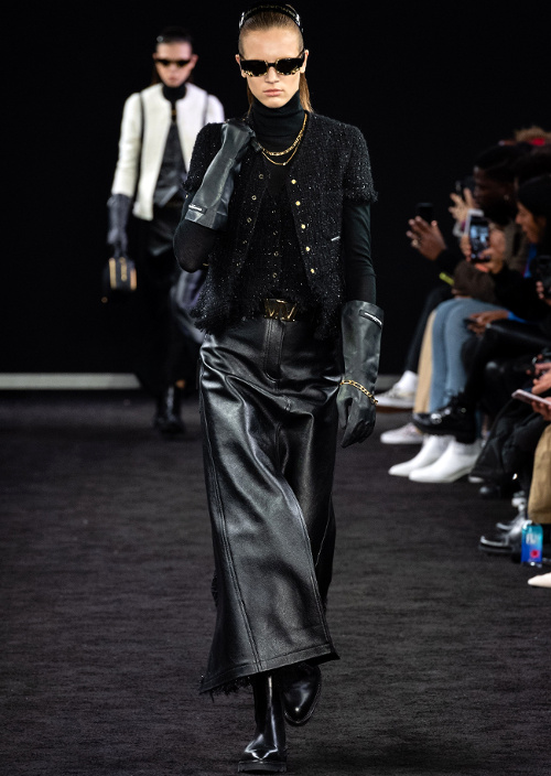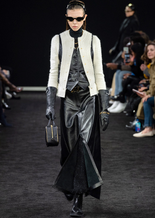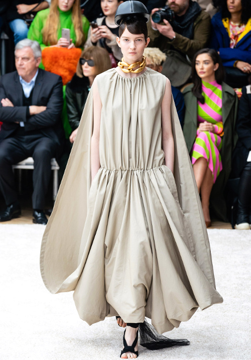 On pense tout particulièrement à ses colliers gourmettes - portés sur un fin pull col roulé réchauffé d'une veste en tweed façon rue Cambon - injectant aux premiers passages du show une saveur insolente jouant avec gourmandise avec les clichés bourgeois. Nous retrouvâmes d'ailleurs ceux-ci quelques jours plus tard - arborant des maillons plus ou moins épais - chez J.W. Anderson (en version XXL), Chanel (en mode cascade) et Bottega Veneta.