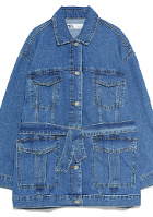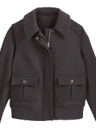 Les manches de la veste se porteront légèrement roulottées de manière à laisser apparaître les poignets du pull. Le pull se glissera sur le devant de la jupe. On pourra glisser des socquettes bleu indigo dans les baskets.