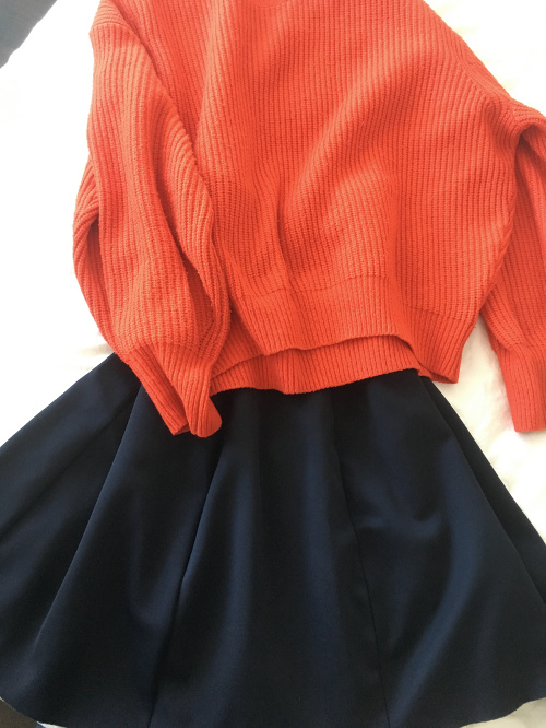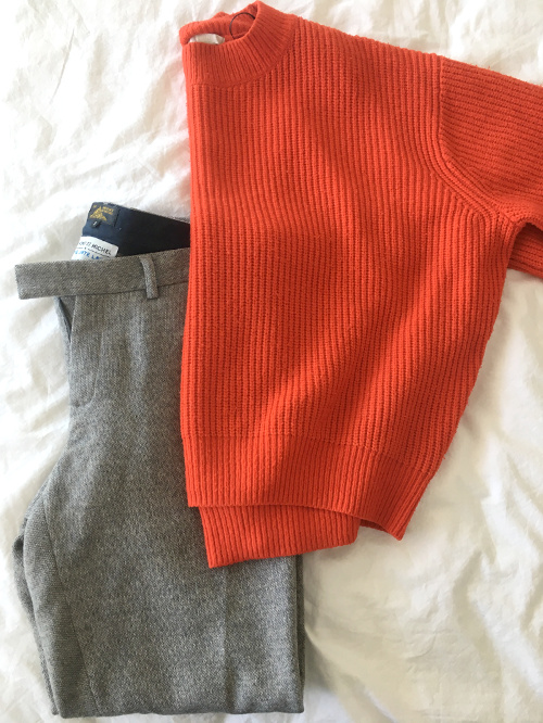 Après réflexion, il me semble que trois raisons peuvent expliquer son "fashion appeal" : Je me sens terriblement à l'aise dans ce pull. Il ne me gratte pas, ne me donne pas trop chaud, ses manches sont assez longues pour que je puisse y réchauffer mes doigts si le coeur m'en dit et ses petits côtes sont parfaites pour flouter une absence de soutien-gorge. Il est par ailleurs suffisamment épais pour être porté seul un matin d'automne, mais également assez fin pour se glisser facilement sur le devant d'un jean ou d'une jupe. De ce confort résulte une attitude fluide qui ne doit pas être étrangère aux regards qu'il attire. Il se porte littéralement avec tout. Il est en effet assez ample pour réchauffer n'importe quelle robe estivale, tandis que sa dégaine nonchalante en fait le partenaire idéal des jupes midi chics ne demandant qu'à se voir twister. Il flatte en outre les jeans slims de par son volume généreux et permet de se composer des looks large/large parfaitement maîtrisés. Sa couleur reste néanmoins son atout principal. Forte sans être agressive, elle est un exhausteur de look à elle seule. Elle fait ainsi des merveilles avec les denims bruts (qui apprécient de voir leur "casualness" vibrer au contact de ses pigments rougeoyants), adoucit la nature militaire du bleu marine et du kaki et égaie les teintes automnales telles que le trio caramel/beige/marron. Sans parler de sa capacité à décrisper n'importe quel gris trop studieux.