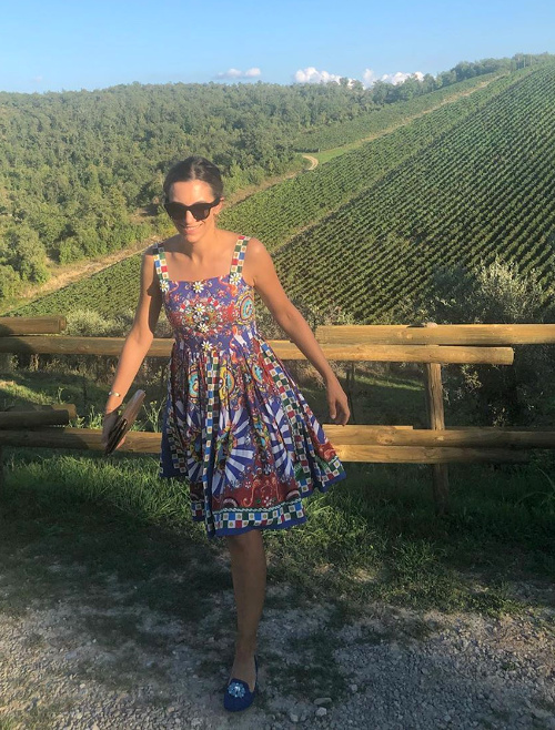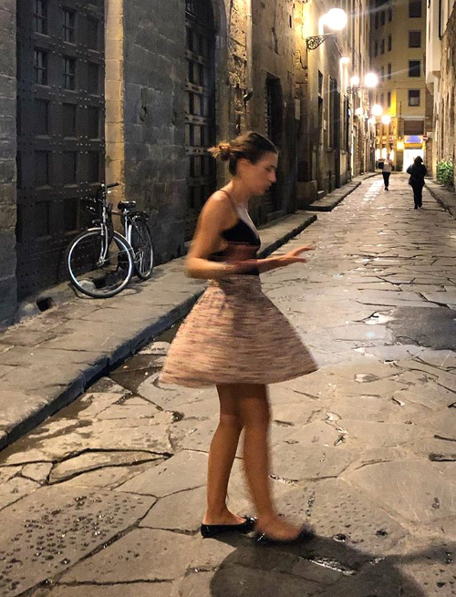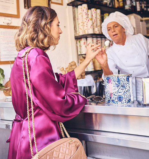 J'aime bien... un style facile et souvent gai. J'adore particulièrement le haut moulant et le jupon imprimé, que j'aimerais bien avoir dans ma garde-robe. Et puis les paysages italiens, l'architecture italienne, les hommes italiens... Il faut dire que tout me dispose favorablement !