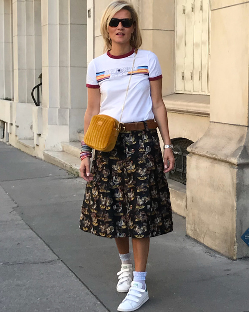 Même si je n'adopterais pas tous ses looks, c'est une bonne idée de piocher ça et là: tweed british et tee-shirt funky, blouson aviateur et T shirt irisé (oh oui), marier gris, jaune et gris perle, baskets à la saveur rétro associées à un petit bijou (en voilà une belle idée)!!!