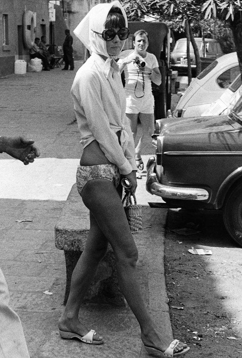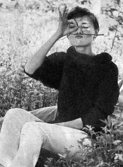 Étonnée de découvrir le panier en osier à son bras (avant Jane Birkin ??), mais aussi la cigarette à la main...