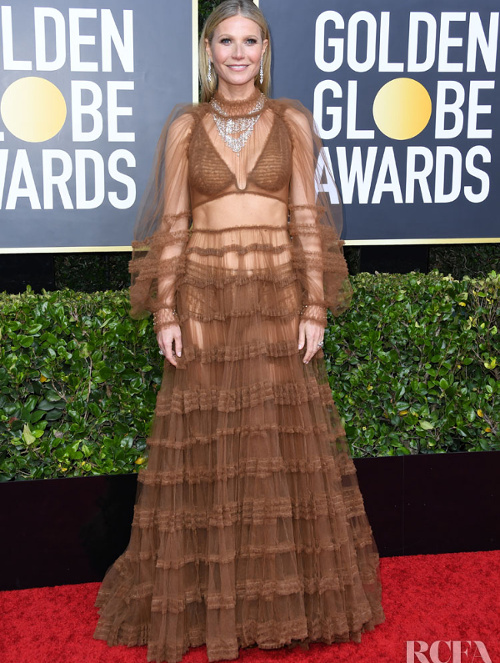 A défaut d'avoir décroché le Golden Globe de la toilette la plus originale, de la pose la plus naturelle (voir ici, ici et là) ou du visage le moins modifié par la chirurgie esthétique, Renée Zellweger a remporté celui de la meilleure actrice. Félicitations ! Teint pâle, tapis rouge et coloris aubergine ne font guère bon ménage (Rachel Brosnahan en Michael Kors). Si on salue la prise de risque chromatique de Michelle Williams, on regrette que celle-ci ne se soit pas avérée concluante (Louis Vuitton). Est-ce la transparence de sa robe Fendi laissant sciemment entrevoir un slip à la teinte équivoque, l'esprit Esmeralda premier degré de l'ensemble ou bien l'absence globale de subtilité ? Toujours est-il que la tenue de Gwyneth Paltrow laisse circonspect (voir ici et là). Un joli minois permet de sauver les robes les plus incongrues, comme nous le prouve Lucy Boynton (voir ici et là). Avis aux amateurs : le poste de "styliste personnel de Charlize Theron" risque d'être bientôt disponible… (voir ici) Nicole Kidman et Scarlett Johansson tentèrent de rivaliser avec la mythique apparition de Julia Roberts dans Pretty Woman (voir ici, ici et là). Apparaître à son avantage en dépit de sa robe Gucci semble décidément être le défi de cette année (Gugu Mbatha-Raw). Si l'on en croit Miu Miu, la chemise de nuit victorienne est une inspiration légitime en matière de robe du soir (Bel Powley).