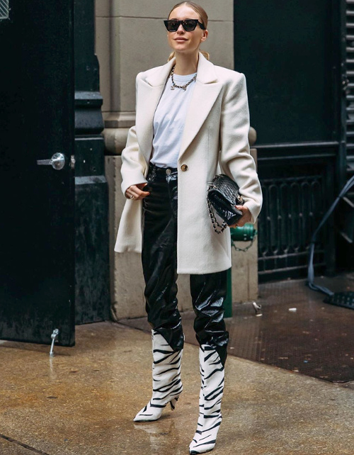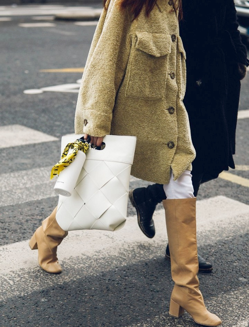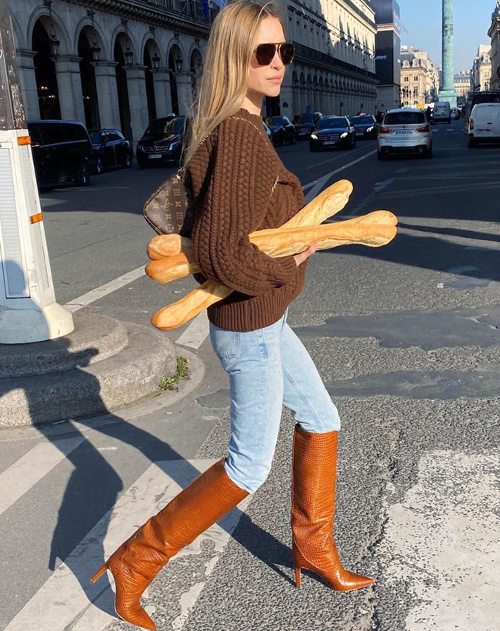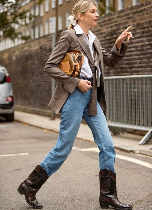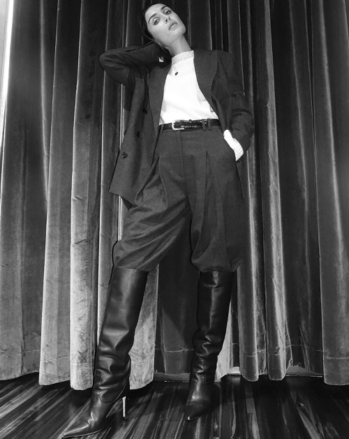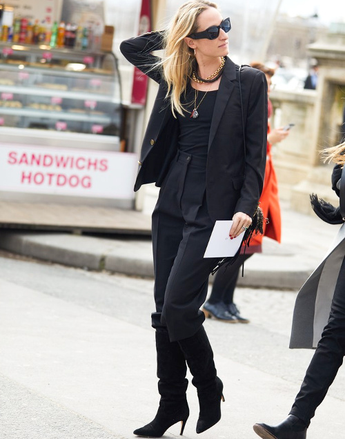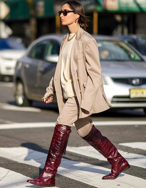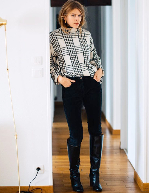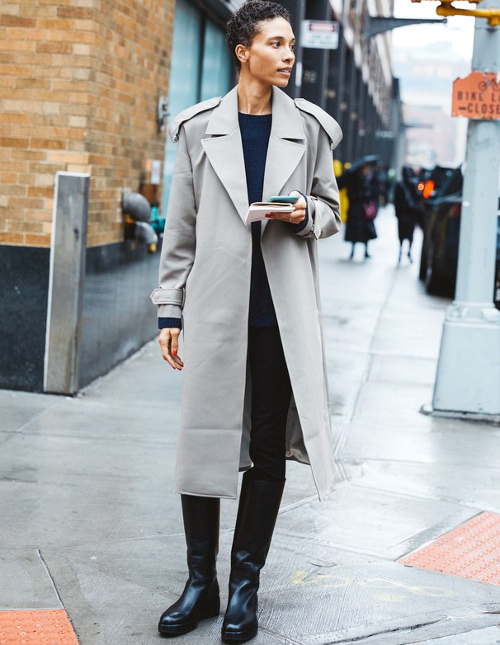 Je pense que ce gimmick pourra être envisagé à condition d'opter pour le duo bottes de bonne facture (voir ici et là) + jean slim (ou pantalon étroit) et de miser sur un style minimaliste ou sobrement chaleureux. Les bottes plates seront ici à réserver aux plus grandes d'entre nous. Plus le bas de la tenue sera près du corps, plus on optera pour un haut ample de type , blazer masculin, etc…