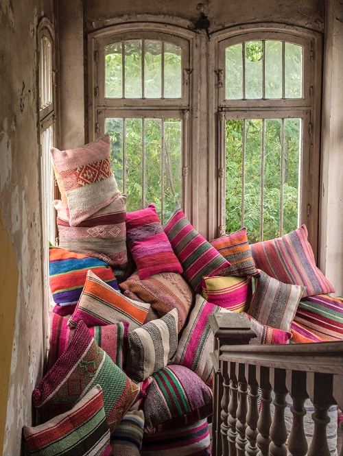 Les bibliothèque jusqu'au plafond dans une pièce qui ne ferait QUE bibliothèque avec des fauteuils confortables et des coussins par terre : mon rêve absolu ! Et justement cet amas de coussins dans l'escalier !!!