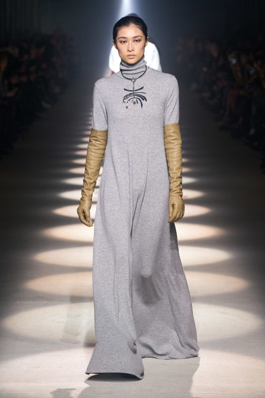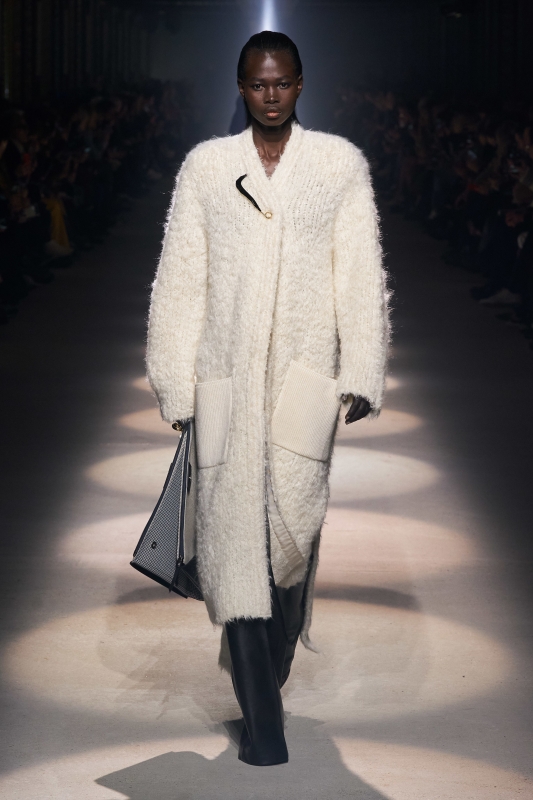 On note par ailleurs que si la femme Givenchy de l'hiver prochain se veut plus powerful que jamais, elle n'en cherche pas moins à arrondir les angles, comme le prouve la carrure adoucie de ses vestes et manteaux. Aussi chic et élégante soit-elle, elle refuse par ailleurs que ses vêtements rendent son quotidien inconfortable. A elle dès lors les longues robes de maille, les costumes légèrement amples, les longs gilets en laine réchauffant un pantalon de cuir ou encore les duos robe/pantalon.