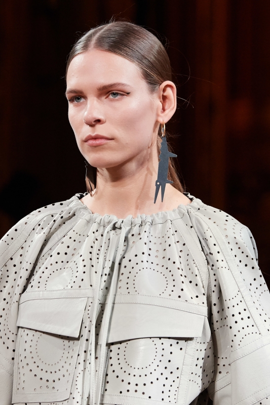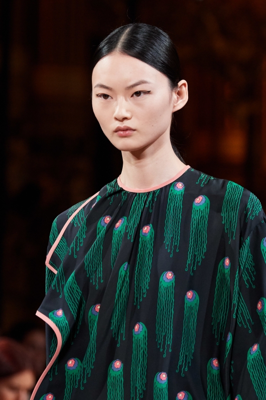 Cette saison, Stella McCartney puise les imprimés de sa collection au sein de l'oeuvre de l'illustrateur Erté (voir ici et là), exprime de manière quasi naïve son amour pour les animaux (voir ici et là), offre une alternative vegan friendly au cuir de vachette à toutes celles ayant rompu avec la consommation de viande et crée le premier manteau avec masque intégré anti-coronavirus.