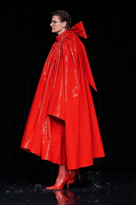 Le manteau mutant capuche/écharpe, le twin set robe/cape, le volume affolant de cette tenue en vinyle rouge ainsi que les costumes étriqués.