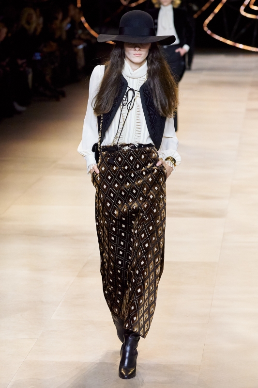 Après avoir initié en mars dernier une véritable déferlante néo-bourgeoise sur le paysage fashion, Hedi Slimane continue de voguer sereinement sur les clichés qu'il a lui-même établis. Et si les composantes de ses silhouettes tantôt sixties tantôt seventies n'ont pas le charme de la nouveauté, elles n'en brillent pas moins souvent par leur portabilité désirable. Des pièces qui, si l'on y regarde bien, évitent la plupart du temps la citation 100% rétro via des coupes légèrement repensées, des matières audacieuses (voir ici et là) et des volumes liftés. On note au passage que le total look sera évidemment à prohiber.