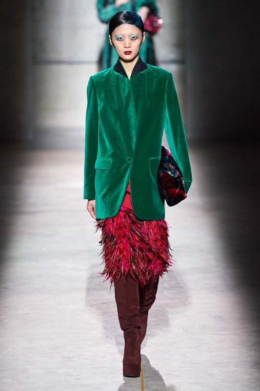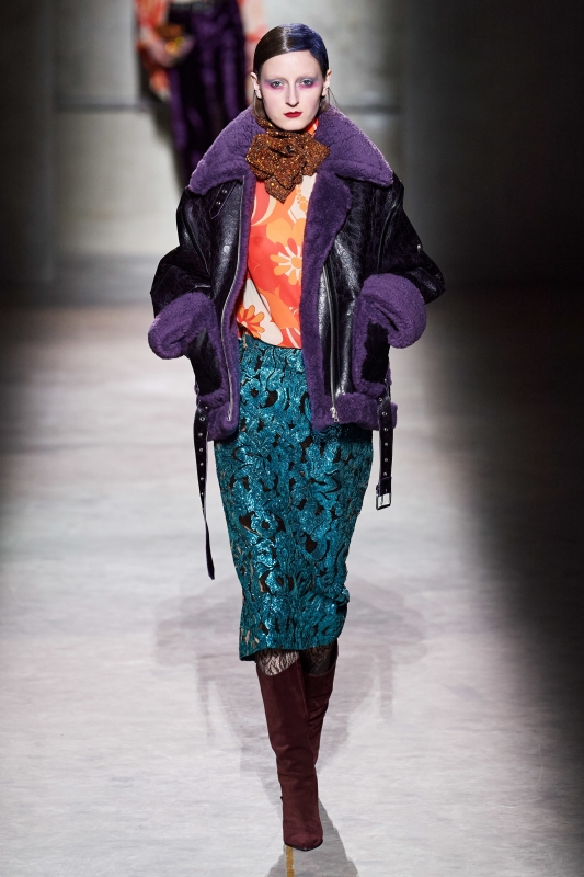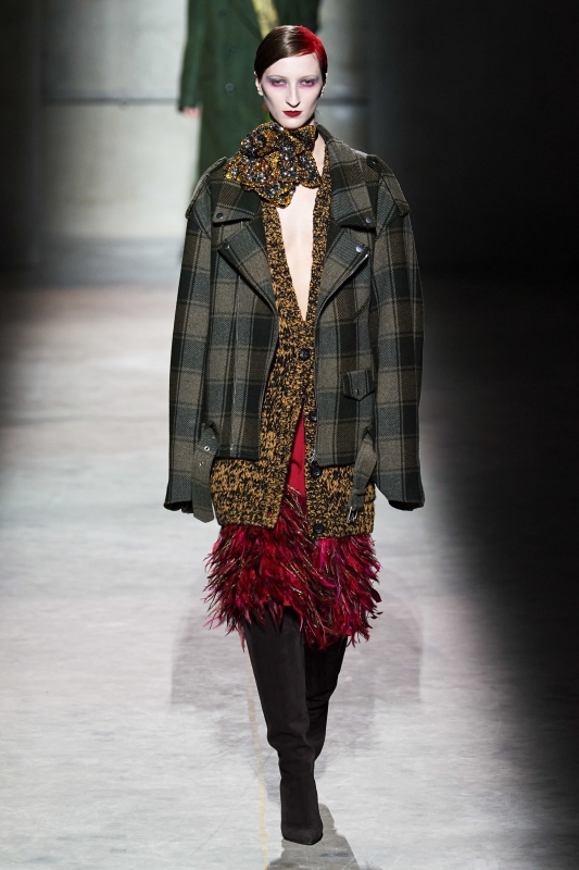 Il en va des collections Dries Van Noten comme des grands crus : leur qualité varie en fonction des années. Or cette saison la grammaire de l'Anversois ne parvient pas à faire mouche. D'ordinaire savoureux, ses télescopages chromatiques agressent (voir ici, ici et là), tandis que ses mix and match sonnent faux (voir ici, ici et là). Et si prises séparément les pièces de cet opus automnal ne manqueront probablement pas de panache, force est de constater qu'agencées sur une note grunge matinée de glamour 80's, elles ne parviennent pas à générer la délicieuse magie à laquelle Dries Van Noten nous avait jusqu'ici habitués.