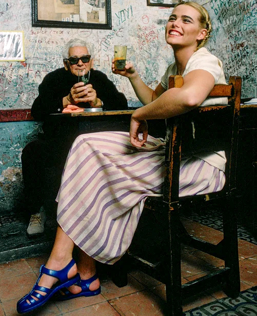 J'adore les chemises superposées, la chemise Hawaï sous le blazer, les fleurs dans les cheveux... Je note aussi le détail du chapeau abîmé : je trouve que l'usure d'un vêtement ajoute un supplément d'âme à une tenue. Je suis sûre que c'était son chapeau préféré et qu'elle l'a porté tout l'été.