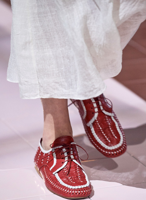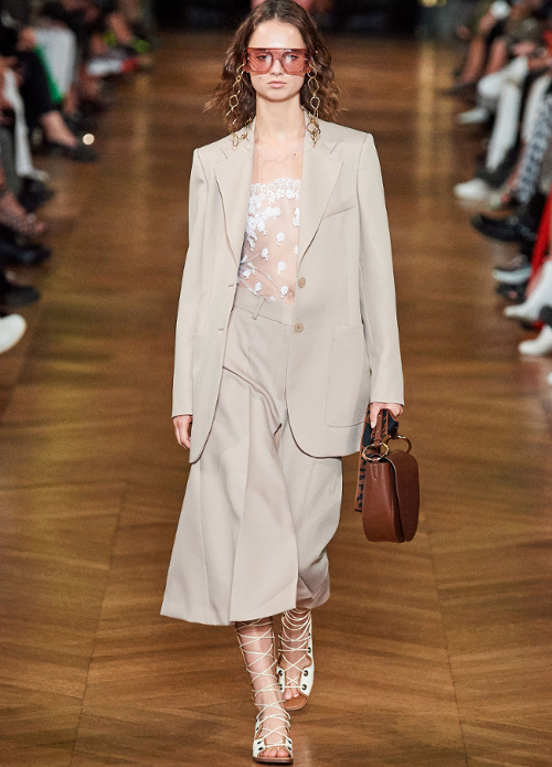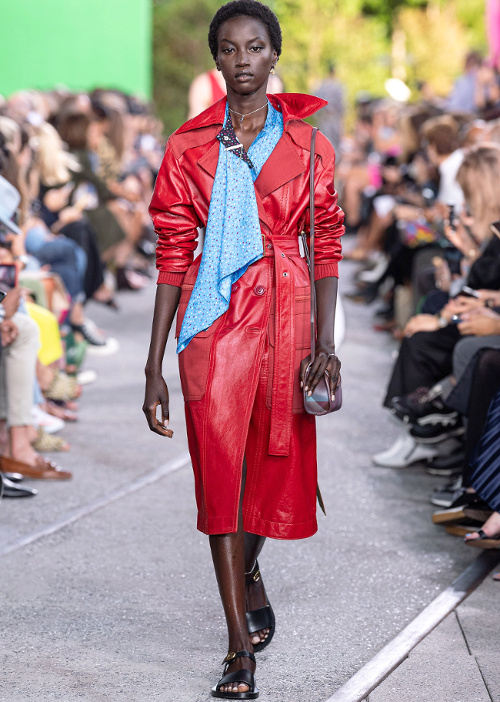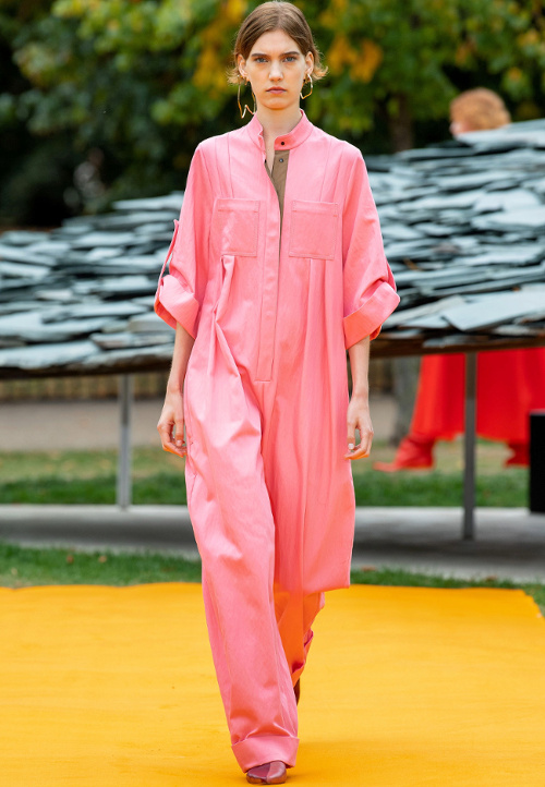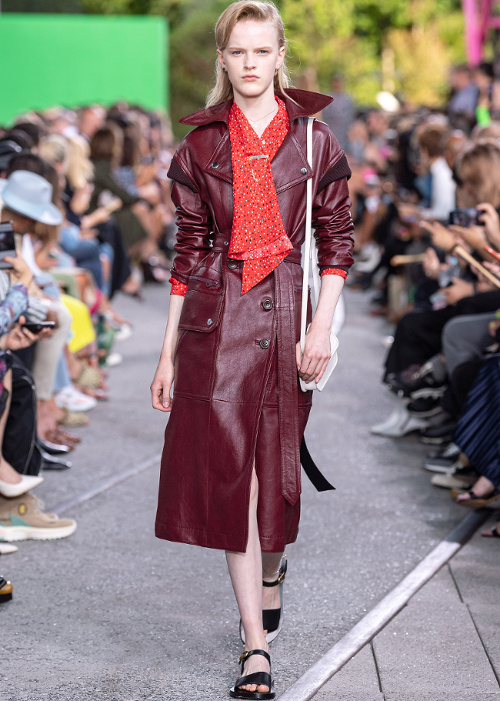 En greffant une ample manche ballon sur une emmanchure de débardeur sporty (voir ici), Clare Waight Keller insuffle une saveur nouvelle à ce volume tant vu cette saison. Ici, le conceptuel gagne en élégance et en portabilité ce qu'il perd en étrangeté. Sans parler de la teinte cigare achevant de gommer toute coquetterie superflue de cette longue robe romantico-pragmatique… Si le all-over de broderies peut rapidement virer au premier degré, il suffit apparemment de l'apposer sur des pièces faussement utilitaires pour le rendre parfaitement digeste (Isabel Marant). Chez Givenchy, le duo top moulant/bas extra large donne naissance à une silhouette aux contrastes photogéniques, entre sophistication piquante et douceur couvrante (voir ici). Pensée comme le prolongement asymétrique du col, la lavallière imaginée par Stuart Vevers gagne en contemporanéité (Coach). Difficile de résister au charme rétro des emmanchures descendues et ourlées de bord-côte de ce trench en cuir bordeaux Coach... En apposant des broderies perles esprit 1900 sur une toile de soie aux allures de lin légèrement rugueux, Miuccia Prada livre une toilette évoquant la candeur d'une jeune fille sans le sou transformant un vieux drap en robe du soir (voir ici). A mi-chemin entre le mocassin amérindien et la Zizi de chez Repetto, les souliers bicolores en cuir tressé Prada pourraient conférer aux shorts en jean une dégaine plus "wild chic" que "casual"… (voir ici) En bordant de biais contrasté les coutures d'empiècements fleuris de ses longues robes estivales, Stella McCartney injecte à ces dernières une dimension graphique inattendue (voir ici et là). Fusionnant détail kaki, rose bubble gum pour fillette coquette et coupe utilitaire revisitée en mode minimaliste, cette combinaison Roksanda fait mouche. D'ordinaire sévère, la jupe culotte esprit tailoring change de nature au contact d'une paire de sandales plates aux lacets montant haut sur le mollet (Stella McCartney). Chez Zanini, le minimalisme du col et la chasteté des étoffes temporisent avec brio l'opulence des manches ballons descendues (voir ici et là).