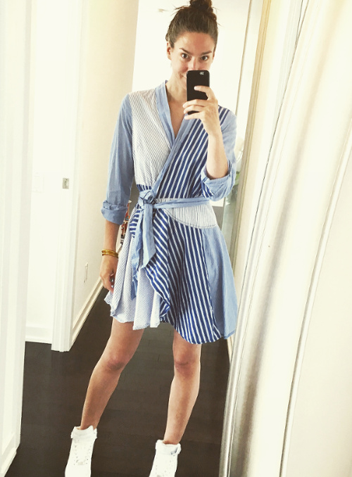 Le combo robe portefeuille / baskets blanches te va à ravir chère Lise 😉