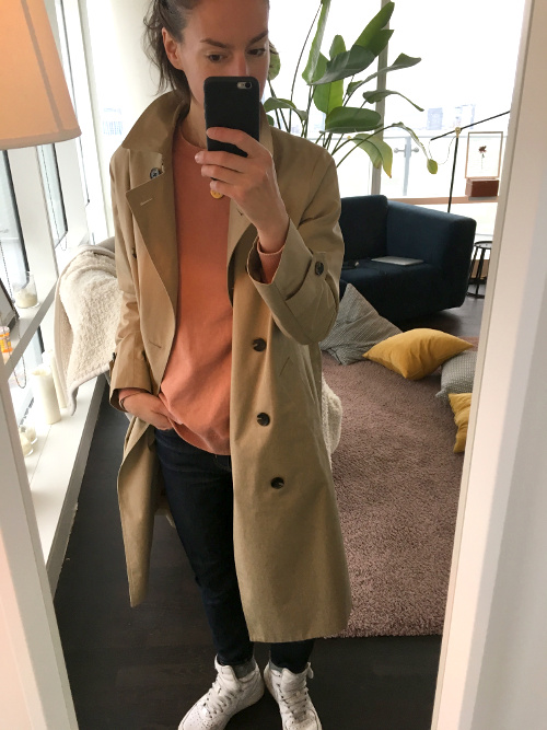 Je voulais attirer ton attention particulièrement sur les coloris car c'est là que la joie s'invite. Comme tu l'as bien remarqué, ton trench beige assorti d'un pull rose (pêche je dirais, ou vieux rose selon toi mais je pense que le vieux rose tend vers une couleur froide alors que pêche est une couleur chaude) t'as agréablement surprise.