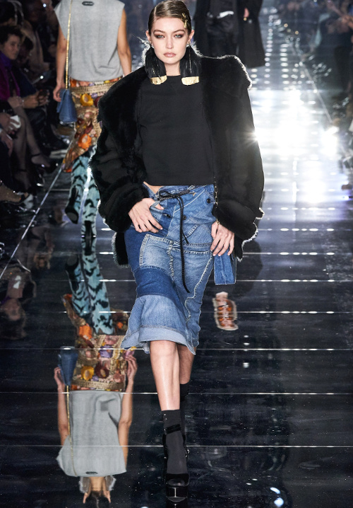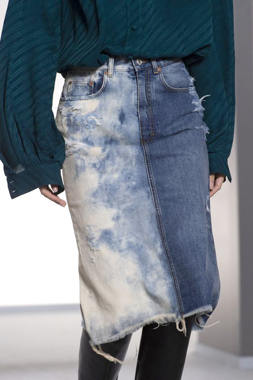 Entre denim javellisé (Givenchy) et découpes patchworks, la jupe en jean droite longueur midi fait quant à elle la part belle aux traitements nineties. Plus clivante que son homologue ligne A, elle n'en possède pas moins une énergie urbaine qui lui permet de s'adapter relativement facilement à un dress code citadin. Il suffira pour cela de lui associer des pièces sobres loin de son ADN grungy/country (Miu Miu) : fins pulls col ronds, bottes classiques, vestes chaneliennes, chemises à fines rayures parfaitement repassées... Restera alors l'épineuse question de la fente frontale centrale. Sachant qu'en fonction du placement de ladite fente, de la densité de la toile de jean et de la coupe générale de la jupe, le meilleur comme le pire pourra advenir, celle-ci devra être tranchée au cas par cas.