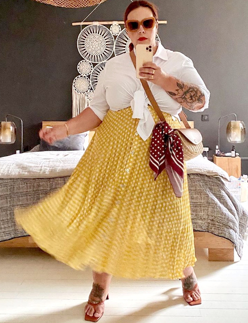 J'aime beaucoup ses associations de couleurs et son style ( grande fan des jupes et robes midi que je suis), elle semble très pétillante.