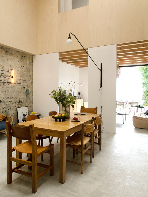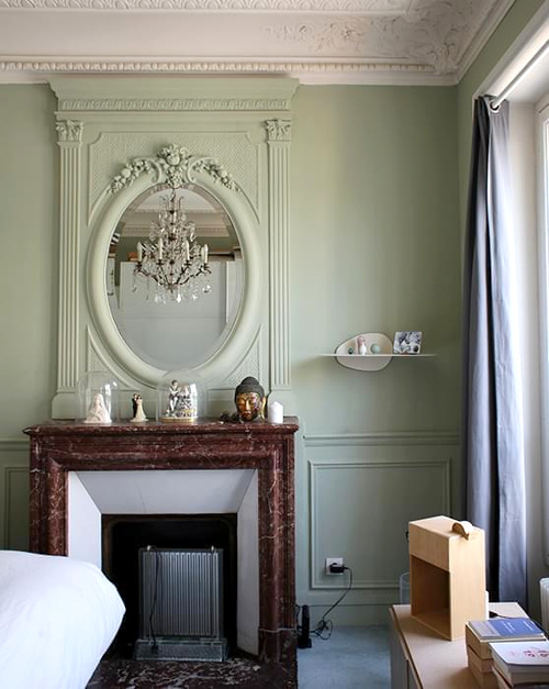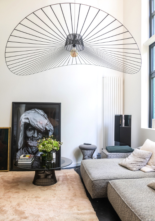De bien jolies choses. J'aime beaucoup les luminaires filaires en lieu et place de lustre, les boiseries et moulures peintes en une seule teinte et les cadres posés par terre (j'ai fait ça chez moi, en attendant et finalement c'est resté :-) ).