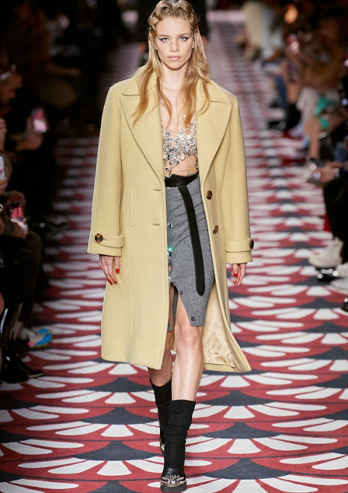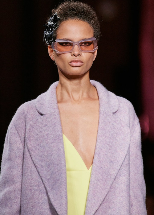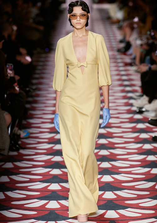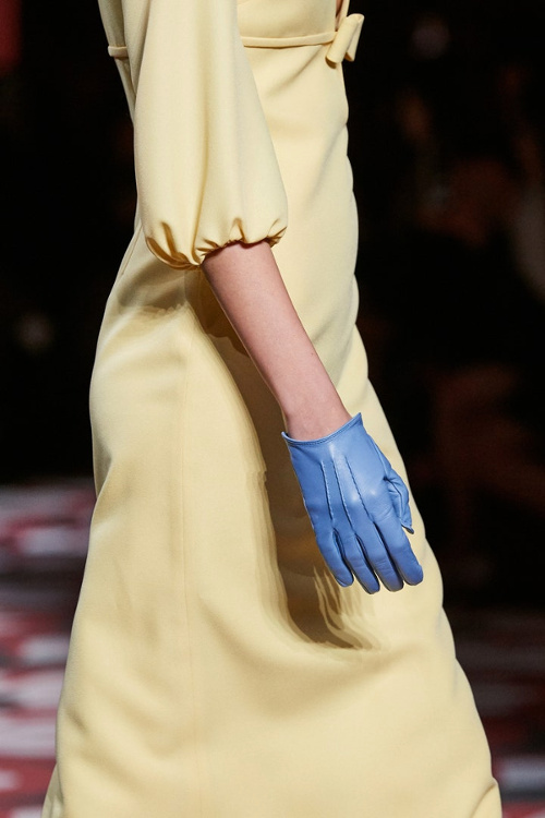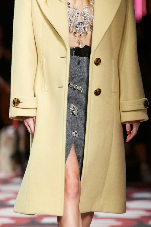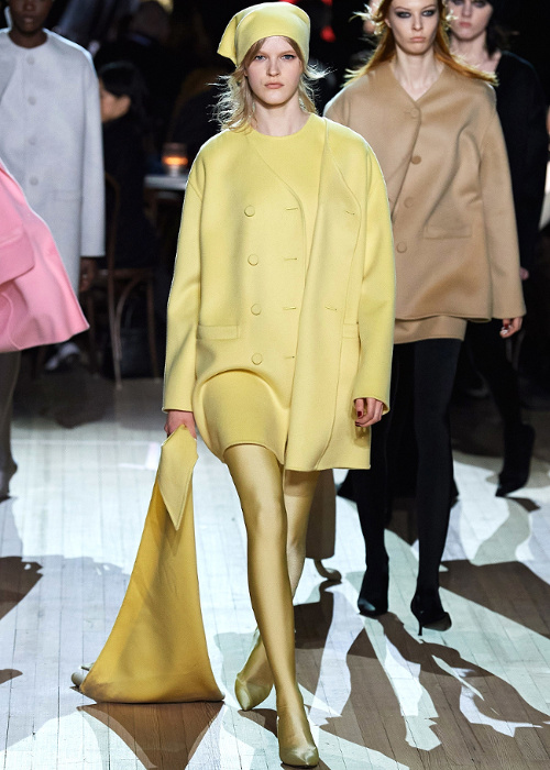 Chez Miu Miu, Miuccia Prada décline la tonalité mimosa en mode "grand soir". Les longs fourreaux (voir ici et là) troquent ainsi leur habituel rouge glamour et autre noir tuxedo contre une douceur inédite à la coquetterie à fleur de pigment, tandis que les pardessus épaulés - susceptibles de venir réchauffer une toilette raffinée - contrebalancent leur dimension masculine au contact d'un jaune évoquant l'un de ceux de Nicolas Roerich. Et si cette tonalité de jaune gagne en vibration urbaine lorsqu'elle se voit accompagnée de gris, c'est néanmoins une fois associée à un lilas moelleux ou à une touche de bleu céruléen qu'elle apparaît la plus novatrice et désirable.