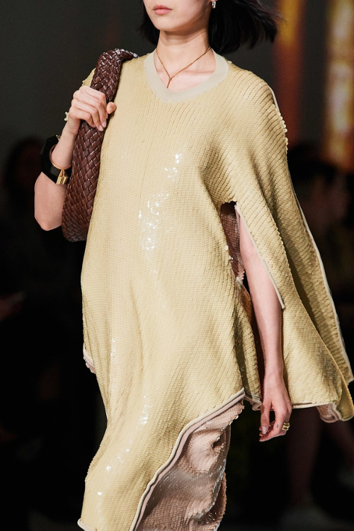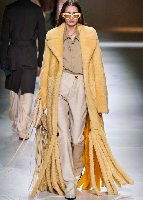 De son côté, Daniel Lee (Bottega Veneta), s'emploie à dissoudre le potentiel "premier degré layette" de ce jaune pâle en lui appliquant un traitement matière audacieux. C'est ainsi que celui-ci se pare de sequins afin de gagner en éclat disco, lorsqu'il n'imprègne pas un pelage duveteux pour néo Cruella d'Enfer. Twisté de la sorte, le jaune beurre frais gagne alors en contemporanéité ce qu'il perd en naïveté. On notera par ailleurs que Daniel Lee n'hésite pas - avec raison - à l'incorporer au sein de la tendance "camaïeux de beige", mais aussi que le marron sera l'un des alliés de prédilection de cette teinte dominant le tableau "La Maison Jaune" de Van Gogh.