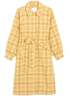 Le mix carreaux british/carreaux plus chaleureux permet de twister l'allure de cette silhouette seventies. On pourra adjoindre d'autres bagues fines et dorées à celle présentée. Le ceinturage de la robe pourra être accentué par une ceinture en cuir un ton en dessous de celui des bottes. Un chignon haut sera parfait pour contrebalancer le volume de l'écharpe.