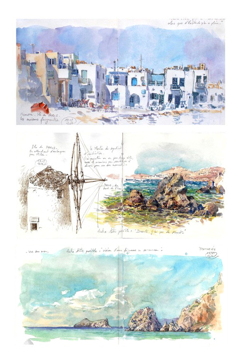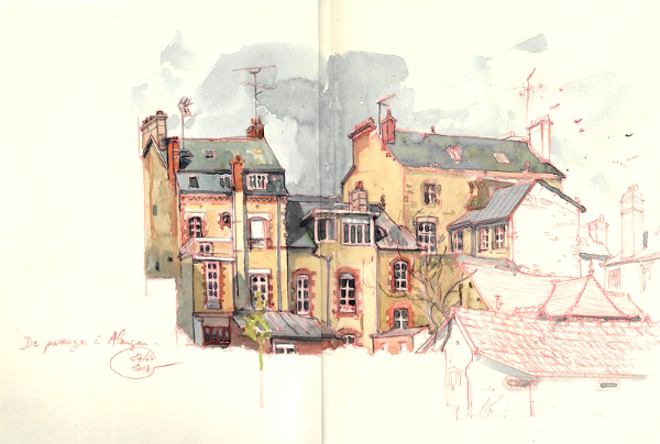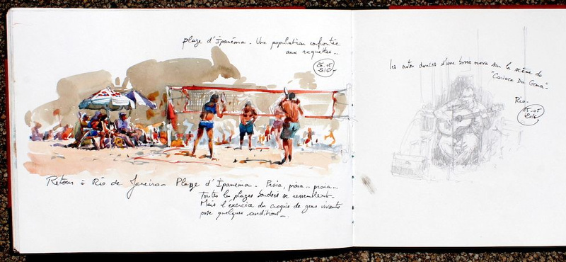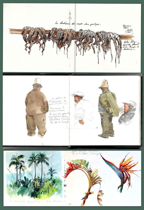 Entre l'urgence de croquer l'instant, le caractère inachevé de certaines pages (voir ici et là), l'écriture déliée des légendes, l'impression de retrouver la magie des illustrations de mes livres d'enfance, mais aussi la liberté de déterminer son format et son cadrage, tout me transporte dans l'oeuvre de ce Breton passé par l'école des Gobelins.