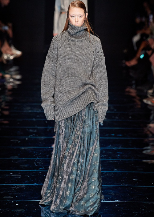 j'aime beaucoup l'association jupe de sirène et gros pull (Sportmax), ainsi que le pantalon en velours (Tod's).