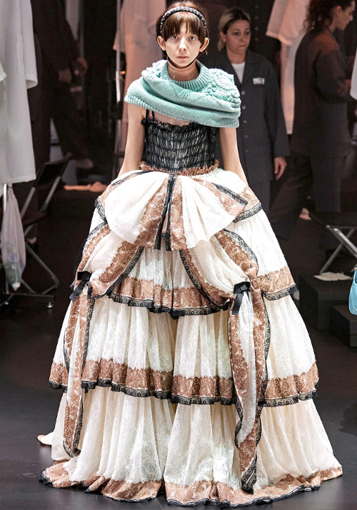 La demoiselle Gucci n'aurait-elle pas "fumé un peu la moquette" avant le défilé ... ??? Faut dire qu'avancer sur le podium avec cette robe que l'on pourrait qualifier d'affreux remake de celle de Scarlett dans "Autant en emporte le vent" doit demander un certain courage ... !