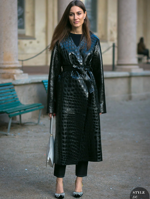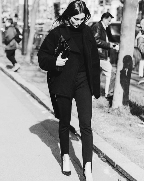 Elle est sublime lorsqu'elle porte des escarpins lacés et une robe chemise. Elle porte beaucoup de noir mais elle mélange les textures, cuir mat, cuir vernis, cuir embossé, transparence... J'ai beaucoup d'indulgence pour les accros au Noir, souvent les plus jolies pièces de pap n'existent qu'en noir. Il suffit de voir les défilés en cours pour l'hiver prochain. Son vestiaire n'est pas redondant et ses « erreurs » sont charmantes, elles révèlent son audace, le style n' est pas une science exacte.