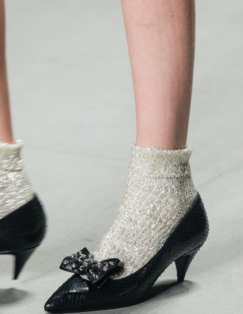 Quand elle est apparente, la chaussette se doit d'être traitée avec autant d'attention et de subtilité qu'un foulard ou un bijou. Si l'on n'y prend pas garde, le port de chaussettes fantaisie premier degré esprit "Bart Simpson" risque de créer quelques malentendus avec nos collègues ou amis qui, n'ayant pas saisi le 8e degré de ce choix stylistique, se mettront à nous offrir des cadeaux incongrus tels qu'un mug à l'effigie de la reine d'Angleterre, un chien miniature dodelinant de la tête ou un porte-gobelet pour canapé. Si sur les podiums les créateurs n'hésitent pas à associer escarpins et chaussettes relativement épaisses (Chanel, Coach), il n'est pas pour autant conseillé de leur emboîter le pas dans la vraie vie. Pour être réussi, ce genre de mix devra en effet être composé d'une chaussette moulant parfaitement le pied, de manière à ne créer aucun amas de maille disgracieux au niveau du décolleté dudit escarpin. Attention cependant : moulant ne veut pas dire translucide ; l'idée est ici de composer des télescopages subtils girly/rock (Saint Laurent 2014) ou casual/bourgeois et non d'être dans la surenchère sexy ou glamour (voir ici et là). De manière générale, on évite les chaussettes totalement blanches qui, en dépit de toute leur bonne volonté, continuent d'être associées à celles que l'on achète par paire de 20 au bazar du coin (voir ici). Si glisser une paire de chaussettes dans ses sandales à talons permettra de porter ces dernières bien après l'été, l'exercice n'en demeure pas moins périlleux. Tout d'abord, seules les chaussettes impeccables - voire neuves - seront ici tolérées : les bouts usés et les mailles distendues jouant sur le talon compromettront en effet l'allure du duo. Il faudra par ailleurs veiller à ce que lesdites chaussettes ne soient ni trop épaisses, ni graphiquement trop marquées hiver".