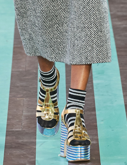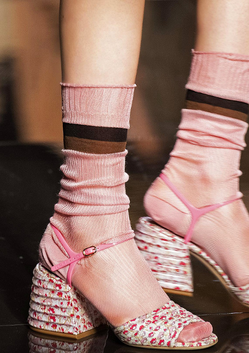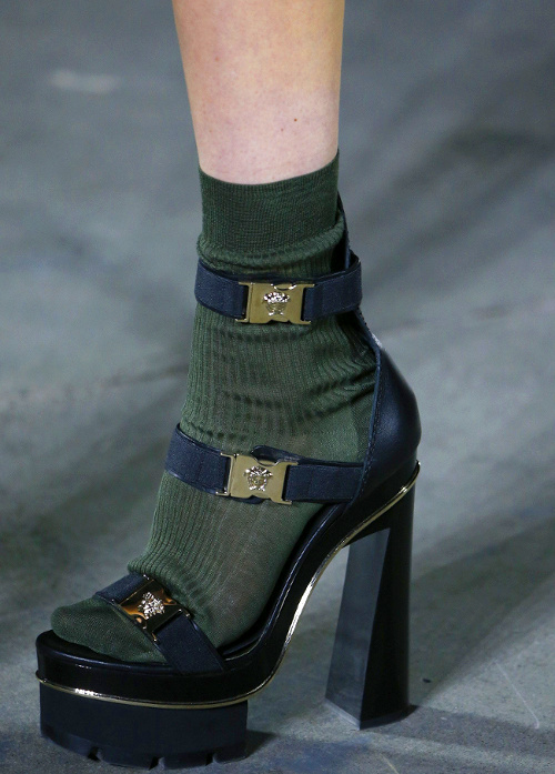 Afin de contourner les difficultés inhérentes à ce genre de duo, on pensera à marier harmonie de teintes et mix and match d'ADN (Versace 2016) ou encore sandales élégantes et longues chaussettes fronçant légèrement sur le bas de la cheville (Ermanno Scervino).