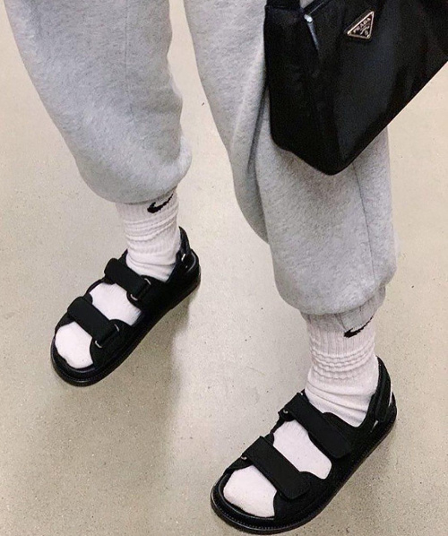 On note enfin que le duo sandales à talons/chaussettes sobres mi-hautes fonctionnera très bien avec les robes chics, mais aussi qu'il permettra de réchauffer visuellement le port du short jambes nues. De manière générale, on laissera aux podiums et aux séries mode les duos à l'originalité criarde (Miu Miu). Cumulant les désavantages de l'escarpin (bout fermé et étroit) et des souliers ultra plats (tendance à tasser la silhouette), la ballerine n'est pas indiquée pour se frotter aux socquettes (voir ici et là). Les mules de type "Gucci" et les sandales plates un brin massives auront tout intérêt à se tenir à distance des chaussettes, qui ne feront qu'accentuer leur dimension "homewear" (voir ici, ici et là).