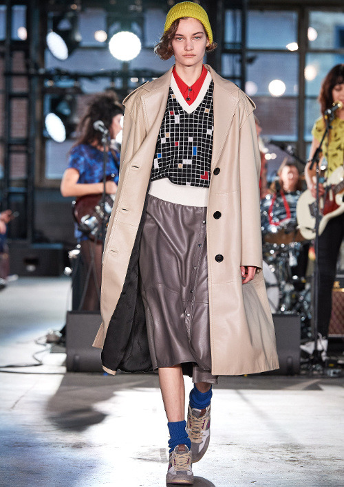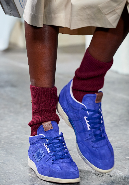 - Ces mêmes souliers marron + ces socquettes bleu ciel + une robe chemise blanche + un blazer en tweed décliné dans des tonalités marron On veillera à opter pour des chaussettes ne serrant pas trop au niveau de la cheville, l'idée étant d'éviter de marquer les mollets sujets à la rétention d'eau. De manière générale, on pensera à jouer sur l'opposition entre cuir et matières glitter, mousseuses ou douillettes. On laissera aux équilibristes fans de Clueless le duo sandales à patins/chaussettes (voir ici). Aussi naturel soit-il, le duo baskets/chaussettes n'en demandera pas moins toute notre attention, celui-ci pouvant très vite se révéler sans saveur ou trop premier degré. On pensera dès lors à miser sur des camaïeux de teintes ( + ces socquettes), sur l'opposition sporty/girly (ces baskets + ces socquettes) ou encore sur le mix ton sur ton (ces baskets + ces socquettes). En matière de mix and match de chaussettes/baskets, le défilé Coach automne/hiver 2020 gagne à être étudié attentivement, et ce tout particulièrement au niveau des harmonies de couleurs (voir ici, ici, ici et là). De manière générale, il est conseillé de laisser apparaître un interstice de peau entre le haut de la chaussette et le bas du pantalon (voir ici et là). Attention à ne pas laisser une paire de chaussettes de couleurs cannibaliser son look (voir ici). Travaillé de manière sobre, le gimmick de la socquette glissée dans l'escarpin se révélera très efficace pour twister une tenue sage (voir ici). Le total look cosy mariant jogging, chaussettes moelleuses et baskets sera à réserver aux week-ends, aux périodes de confinement et aux promenades à la campagne (voir ici).