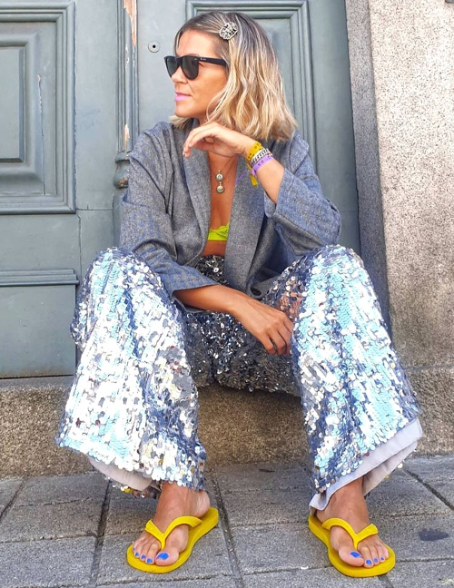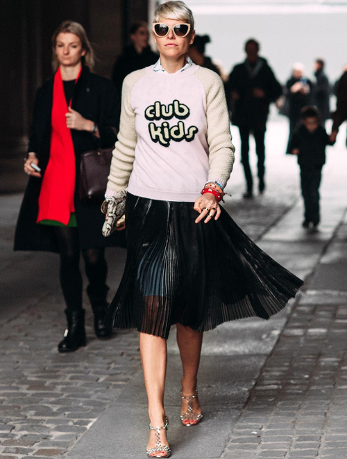Porter un costume imprimé de manière casual (voir ici). Marier ample jupe fruitée et tee-shirt à message (voir ici). Oser la pédicure funky susceptible de nous redonner le sourire à chaque regard vers le sol (voir ici et là). Troquer sa veste en jean (ou son trench) contre une veste folk haute en couleur (voir ici et là). Associer vichy rouge et rayures rouges (voir ici). Dissocier la couleur de ses lacets (voir ici). Mixer rose et vert (voir ici, ici, ici et là). Se faire un chignon haut perroquet friendly (voir ici). Sortir une de ses pièces "soir" du placard et la porter en journée de manière ultra décontractée (voir ici, ici, ici et là).