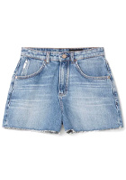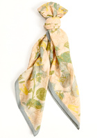 Le foulard se nouera en bandeau turban sur un chignon bas. Le tee-shirt se glissera à demi dans le short. On pourra ajouter une paire de lunettes de soleil aviator dorées.