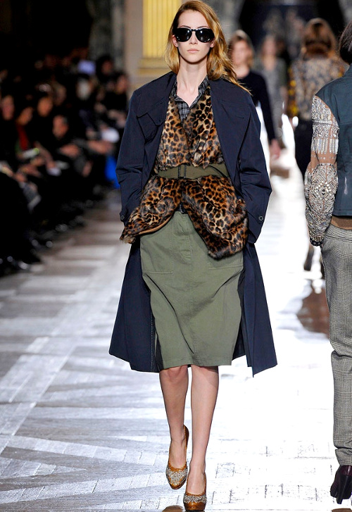 En 2010, Dries Van Noten opère un coup de maître en repensant totalement le dress code de l'imprimé léopard. Jusqu'ici connoté "glamour poussiéreux" (voire vulgaire), ce dernier trouve ainsi sous ses doigts une nouvelle aura. Il faut dire qu'en se mariant au kaki army et au classique bleu marine, le motif tacheté cher aux vamps des années 80 dévoile un potentiel insoupçonné d'élégante casualness. En une silhouette, Dries Van Noten donne le coup d'envoi de la réhabilitation fashion du léopard.