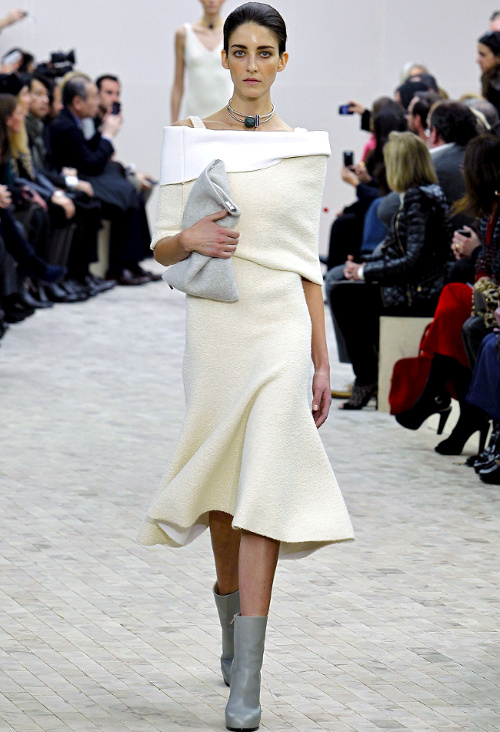 L'évidence du look ouvrant le défilé Céline automne/hiver 2013 me percute avec une douceur fracassante. Ligne, tombé, texture, sensualité, modernité : Phoebe Philo fusionne avec une dextérité cérébrale - mais néanmoins non dénuée de chaleur - les composantes de la perfection. Au sein de cette tenue à la fois moelleuse et exigeante, la femme Céline se sensualise.