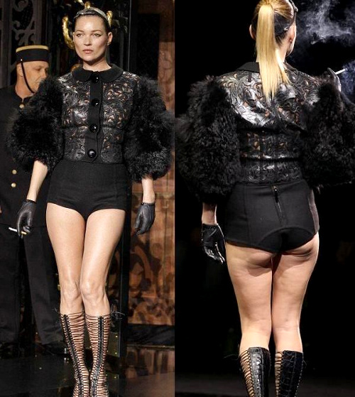 Dans une ambiance très "Charlotte Ramplingienne", les modèles défilent, dévoilant des atours évoquant l'univers SM. Et si ceux-ci n'impriment pas tous la rétine, le dernier passage du show fera quant à lui parler pendant plusieurs semaines. En culotte taille haute, cigarette à la main, Kate Moss y affiche avec sa morgue habituelle une fesse moins ferme que par le passé. Un léger lâcher-prise qui n'est pas pour me déplaire...