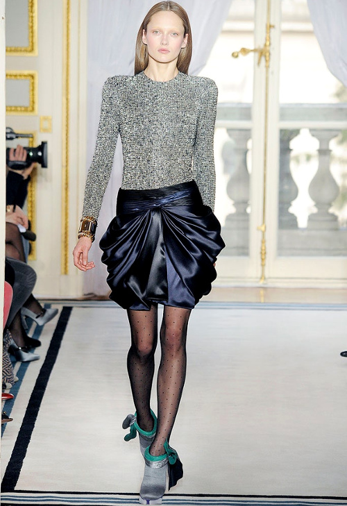 Tous les éléments sont ici présents pour composer une tenue premier degré, une dégaine datée, un look cliché… et pourtant, cette silhouette Balenciaga fonctionne à merveille. Mieux : elle renouvelle à elle seule le concept de tenue de soirée. En travaillant son drapé de satin en pagne chic et ses matières glitter en cotte de mailles seconde peau subtilement futuriste, le tout sur des volumes pensés de manière à ne pas entraver la gestuelle, Nicolas Ghesquière offre une nouvelle dynamique à la notion de "soir".