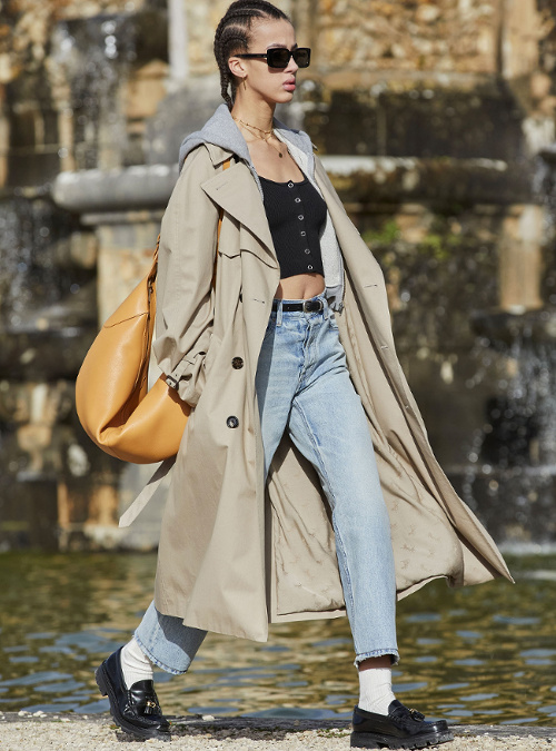 Années 80 : Les chaussettes blanches légèrement lâches se glissent dans une paire d'escarpins et s'accompagnent d'une jupe droite bleached et d'un ample pull rose layette (voir ici). 2021 : On conserve les chaussettes blanches mais on les choisit moulant la cheville. On troque le look quadra-girly contre l'ensemble mocassins à semelles crantées, jean 7/8, fin gilet noir porté à même la peau et trench camel (voir ici).
