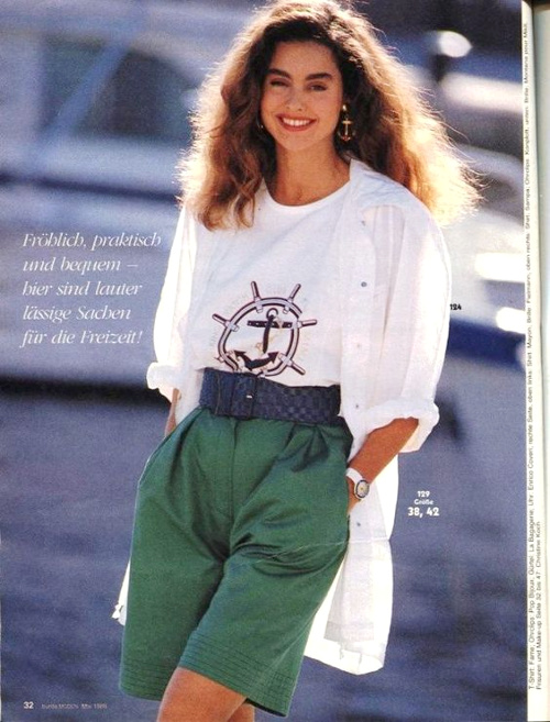 Années 80 : La chemise oversize se porte très longue et déboutonnée sur le combo tee-shirt large/bermuda coloré (voir ici). 2021: Elle se boutonne à demi, se décline dans des tissus évoquant l'univers masculin et délaisse le sage bermuda en toile au profit de pièces plus audacieuses (voir ici).