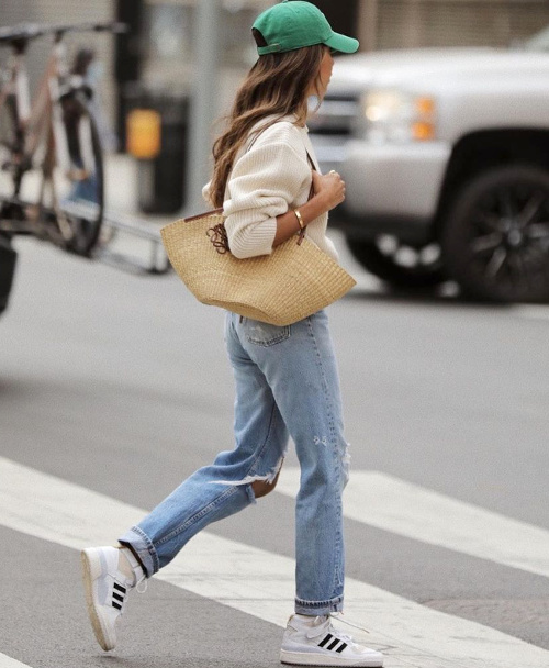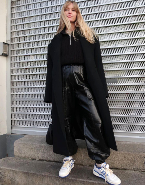 Années 80 : Les Adidas Forum affectionnent les chaussettes épaisses et colorées fronçant sur la cheville ainsi que les blousons d'aviateur un brin trop grands (voir ici). 2021 : Elles se portent désormais avec tout (voir ici, ici et là).