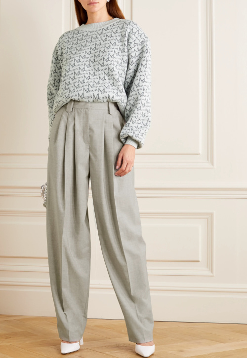 Années 80 : Le pantalon à pinces se casse à peine sur la cheville, assume une coupe légèrement fuselée, se porte taille haute et se mixe au tandem ballerines/collants pastel (voir ici). 2021 : Plus long, plus ample, il semble toujours attiré par les souliers blancs, mais cette fois-ci à talons. Il a par ailleurs abandonné le blazer et le col mao très "working girl en week-end" pour un sweat ton sur ton adoucissant sa nature tailoring (Magda Butrym).