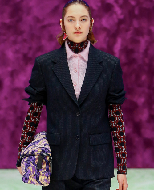 Années 80 : Le sous-pull uni se glisse sous un pull légèrement col V et se réchauffe d'une veste en cuir cintrée (voir ici). 2021 : Recouvert de hiéroglyphes sixties, il adopte une dégaine rétro conceptuelle en s'associant au tandem polo en laine/blazer (Prada).