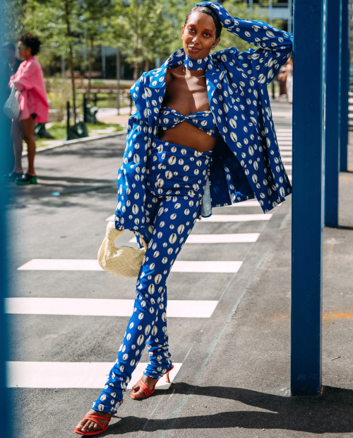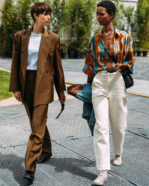 Années 80 : Les costumes larges s'accompagnent de tous les attributs de la femme puissante : gants en cuir, lunettes de soleil acérées, coupe garçonne... (voir ici) 2021 : Ils sont toujours présents, mais on les porte désormais dépareillés et avec beaucoup plus de légèreté (voir ici).