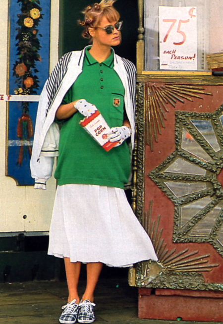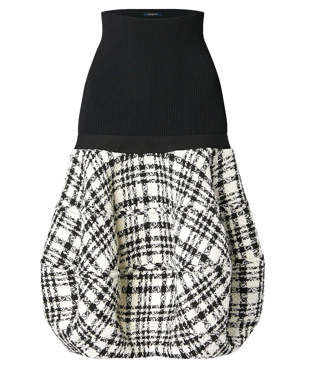 Années 80 : Les jupes midi s'octroient une récréation sportwear en se glissant sous un long polo (voir ici). 2021 : Nicolas Ghesquière imagine des jupes midi dont la taille élastique descendant sur les cuisses permet d'obtenir une silhouette évoquant celles des années 80 (voir ici).