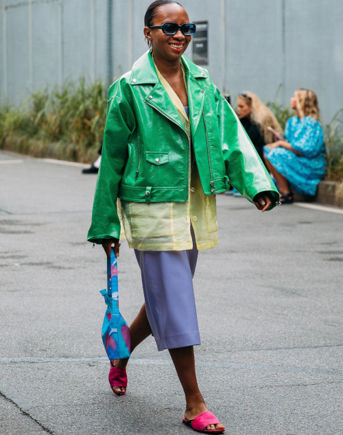 Années 80 : Le vert et le noir s'entrechoquent à coups de coupe structurée et de détails bourgeois (voir ici). 2021 : Le vert s'adoucit aussi bien dans son intensité que dans les matières qu'il imprègne. Le noir n'est quand à lui là que pour lui injecter une touche citadine (voir ici, ici et là).