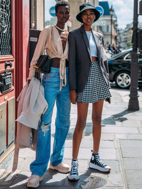 Années 80 : Les mini-jupes aiment la compagnie des ballerines (voir ici). 2021 : Elles s'accompagnent dorénavant des dernières baskets en vogue (voir ici).