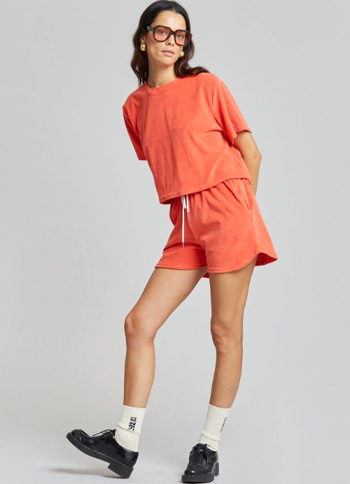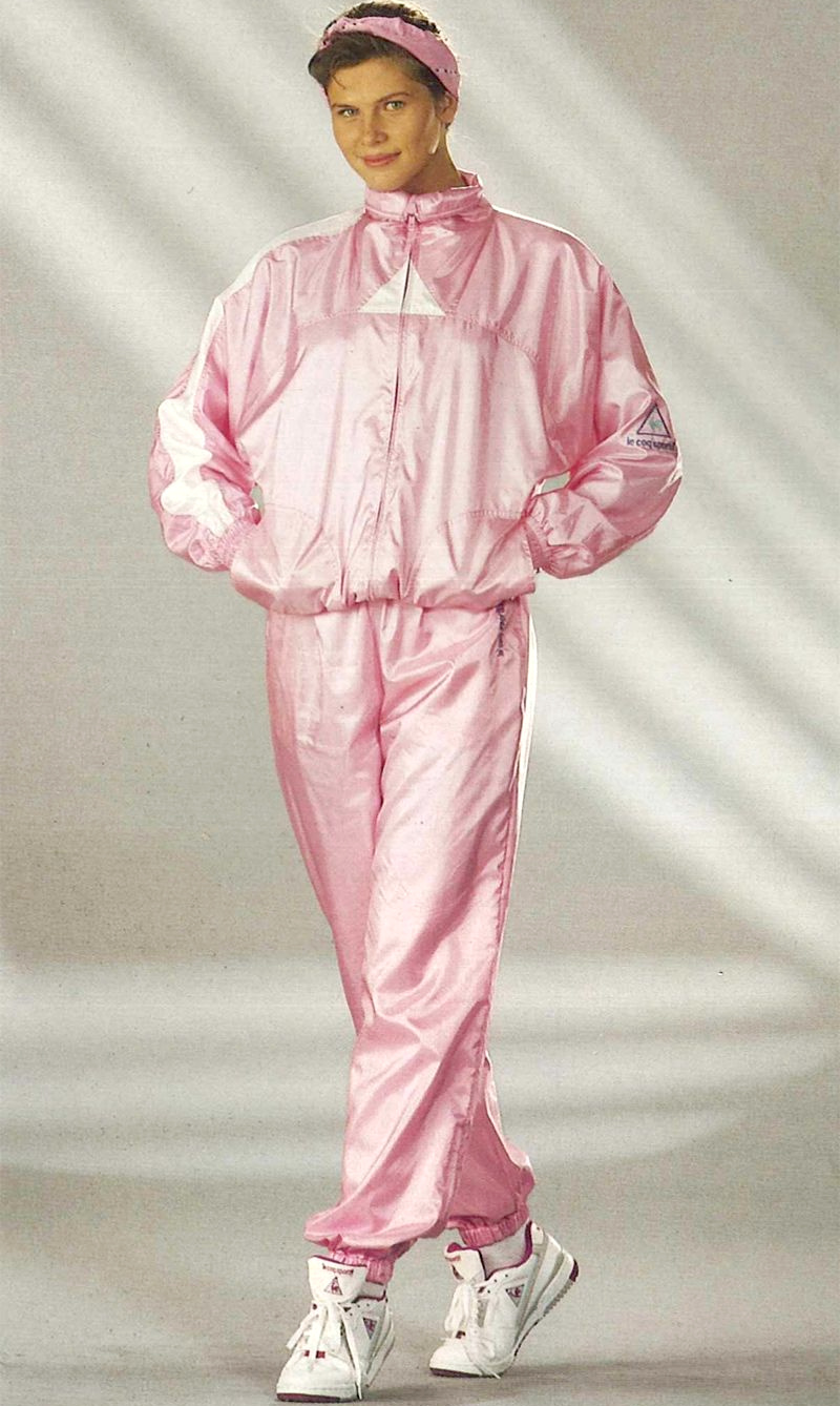 Années 80 : Les tenues sportswear se déclinent en monochrome (de préférence pastel) et se portent pour faire du sport (voir ici). 2021 : Le survêtement a cédé la place à des ensembles short/tee-shirt au monochrome plus vif. Contrairement à leurs aînés, ces derniers ne sont pas destinés aux séances de footing, mais à la vie quotidienne. Les baskets ont d'ailleurs disparu au profit de brogues épaisses ou de sandales délicates (The Frankie Shop).
